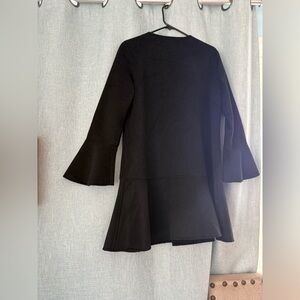 Chic black cape coat with flared sleeves. Stylish and versatile. Perfect for layering.