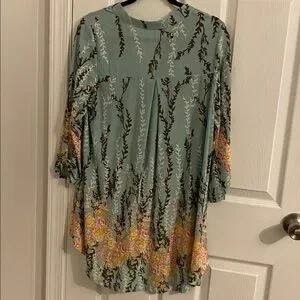 Chic floral blouse with a V-neck design. Features a blend of green and yellow hues. Ideal for casual outings.