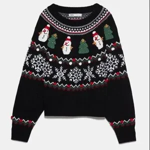 Zara Christmas Snowman Tree Knit Sweater Pullover Holiday Sweater Size Small