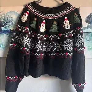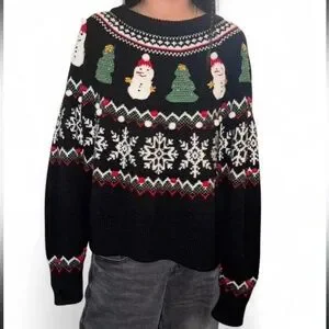 Celebrate the holidays in style with this festive black Christmas sweater. Featuring playful snowmen and Christmas tree designs, it's perfect for spreading cheer. Stay cozy and fashionable this season.