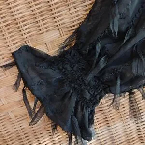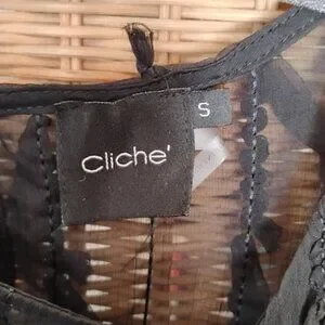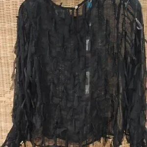 Black women's blouse dressy, business, casual. Long, blousy sleeves with elastic smocking to gather at wrist. The true color of this blouse is jet black (pic of sleeve accurate). Brand: Cliche size small. Fits loose, very sheer fabric with tied in tassles of same sheer black fabric. Light weight, flowy. Closure is one capiz shell button. Long enough to tuck in or belt. Hand wash, hang dry, 100% polyester. Travels well.
