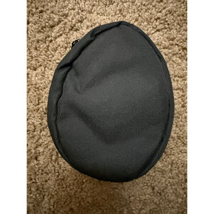 This is a pre-owned, black Beats brand headphone case, featuring a pink Beats logo on the front. The case has an oval shape and is constructed from a textured fabric material. It includes a zipper closure, visible along the edge in one image. The interior is lined with a light-colored, soft fabric. Visible signs of wear include minor creasing on the interior lining.