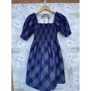 Excellent condition, A rare dress from Hill House's holiday collection. Navy blue and silver check. Smocked style. Puff sleeves. Tie at back. Size small armpit to armpit 14” inches +