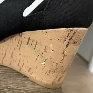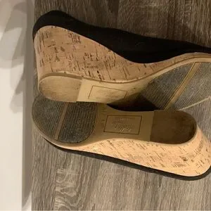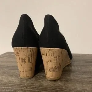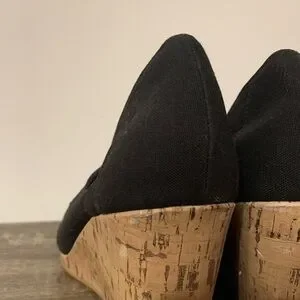 Elevate your style with these elegant black wedge shoes featuring a natural cork heel. Perfect for any occasion, these wedges offer both comfort and sophistication.