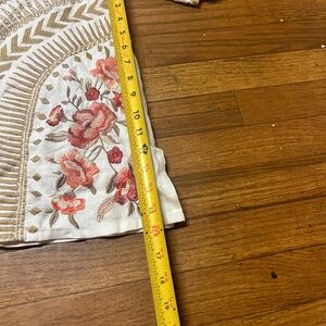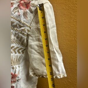 Chic white blouse with pink floral designs. Features intricate embroidery. Ideal for stylish looks.