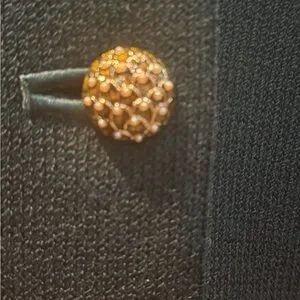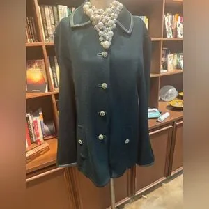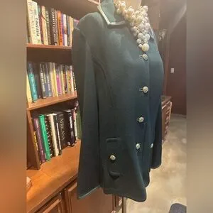 Sophisticated green blazer with 7 elegant gold enamel and pearl buttons. Perfect for formal and business occasions. Trimmed in leather on collar and sleeves. Classic Santana knit.