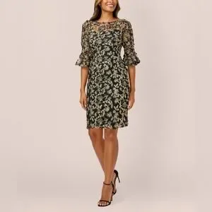 Adrianna Papell sheath dress with metallic embroidery in a soft floral pattern. Features an illusion bateau neckline and three-quarter length sleeves with flared cuffs.