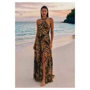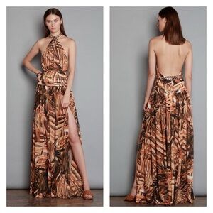 BRONX & BANCO Kenya Maxi Dress Silk Halter Chain Animal Print Brown Medium NWT