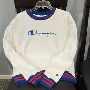 Classic Champion sweatshirt in white. Features blue and red trim. Perfect for casual wear. Thicker style sweatshirt