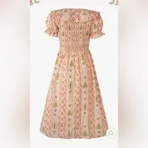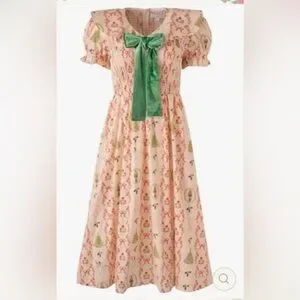 Charming floral dress with a green bow. Features short sleeves and a flowing skirt. Perfect for any occasion.