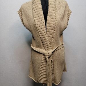 Stay cozy and stylish with this tan sweater vest. Perfect for layering, it features a chic belt for a flattering fit. Ideal for any casual outing.