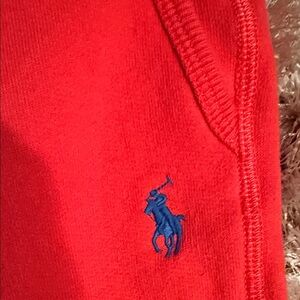 Vibrant red jogger pants with iconic logo. Soft and comfortable fabric. Ideal for casual outings.