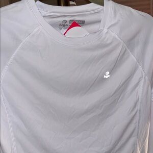 White long sleeve shirt with 50+ UV protection. Lightweight and breathable. Ideal for outdoor activities.