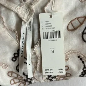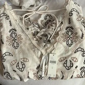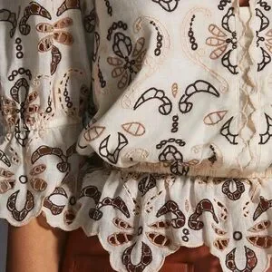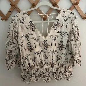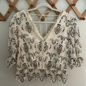 Elegant cream top with intricate black embroidery. Features a V-neck and ruffled sleeves. Perfect for a chic look.