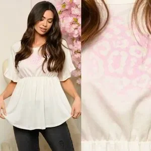 NWT Boutique item. Private label. Ivory short flutter sleeve animal print tunic top. Animal print is in a light pink ombre wash. Multiple sizing options available: small, medium, and large. Model is wearing size Small.