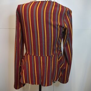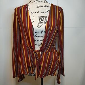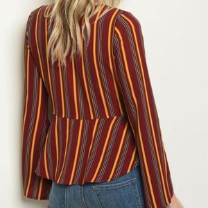 NWT Boutique Blouse – Deep V-neck striped tie-front top with bell sleeves and flattering peplum fit. Features a knotted front tie and plunging neckline. Colors: red, mustard yellow, and navy stripe pattern.