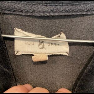 94% polyester, 6% spandex. Lou & Grey. Dark gray super soft velour. Pullover hoodie sweatshirt. Drawstring in hood. Front kangaroo pocket. Relaxed fit. Excellent condition.