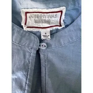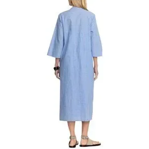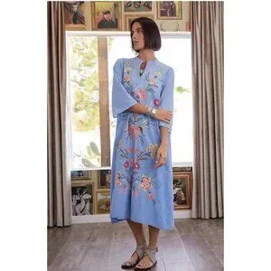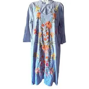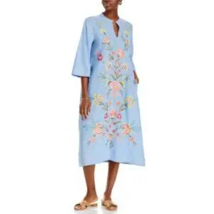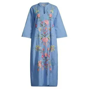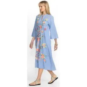 Johnny Was dress chambray embroidered midi floral boho linen look resort vacation cruise caftan tunic blue cotton summer elevated casual coastal grandmother chic garden wedding brunch designer boutique feminine lightweight flowy cottagecore chic anthropologie free people style laguna beach style santorini dress Hawaii outfit spring style