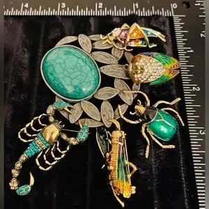 Vibrant brooch set featuring insects and a scorpion. Includes turquoise, green, gold, and multicolor designs. Perfect for adding a unique touch to any outfit.