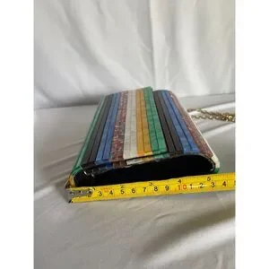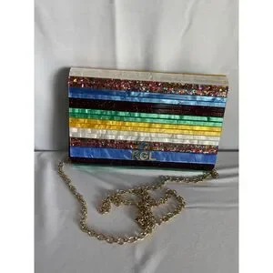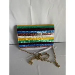 Vibrant clutch with multicolor stripes. Features a gold chain strap. Perfect for adding a pop of color. A little frayed on the edges. Not very noticeable. See pictures. Has many miles left.