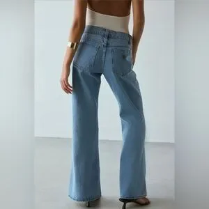 New with tags! Updated Abrand jean in a slouchy silhouette. Designed in a rigid denim featuring a low-rise waistline and a relaxed fit through the butt & thighs and a dramatic flare from knees to hem. Finished with classic 5-pocket styling & an Abrand dice patch at the back pocket.