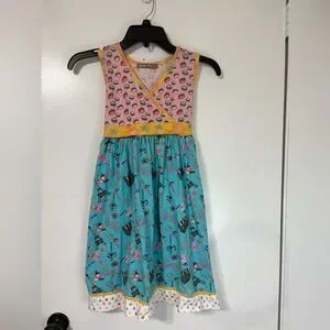 The Jelly the Pug Girls Multi-Color Cotton Cute Madeleine Paris Print Dress in size 12 is a vibrant and whimsical dress perfect for various occasions such as travel, parties, casual outings, and christenings. Made from 100% cotton, this knee-length dress features a sleeveless design with a V-neck and ruffle accents. The novelty pattern with flower characters and a colorful, multicolor print adds a fun and playful touch to the dress. The tie in back detail and high waist style give it a unique and charming appeal, making it a popular choice for young girls who love princess and fairytale themes.