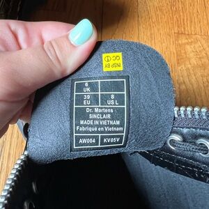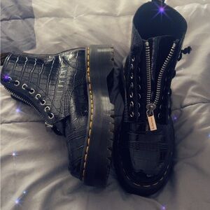 Stylish black croc-embossed combat boots. Features chunky sole and double zippers. Iconic Dr. Martens design.