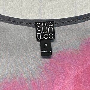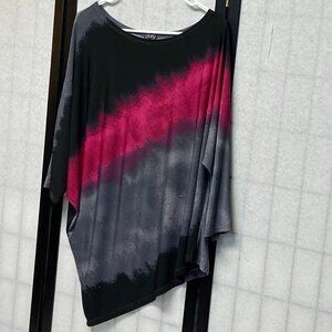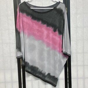 Relaxed Fit Dolman Sleeve Asymmetrical Ombre Tunic Top from Clara Sun Woo. Lovingly worn - looks in excellent condition. Swingy oversized silhouette. Stretch knit with ombre colors from grey to pink to black. The color stripes run at a diagonal that accents the asymmetrical hemline. Boat neckline finished with turn back hem. Three quarter length batwing sleeves. Slightly longer in back. Pull on styling. Hits from hip to mid thigh. Offers effortless style and ultimate comfort — perfect for travel, work, or a night out.