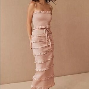Chic and stylish blush pink midi dress. Features layered ruffles and a tie waist. Perfect for any occasion.