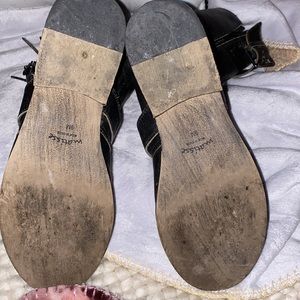 Stylish Matisse combat boots. Black leather with distressed accents. Lace-up front with buckle detail. Durable and trendy.