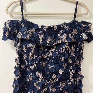 Chic navy blue dress with floral lace. Asymmetrical hem adds flair. Off-shoulder design for elegance.