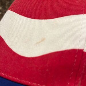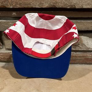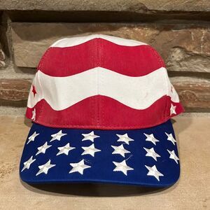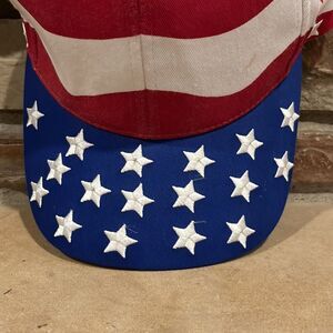 Nissin American flag AOP hat. Adjustable slide back. Embroidered stars. Some pulled threads on the stars. Some discoloration of the headband. Gently used preowned condition, see photos.