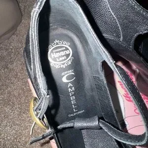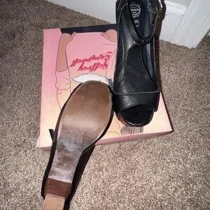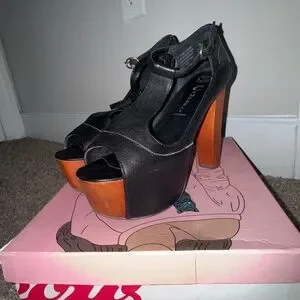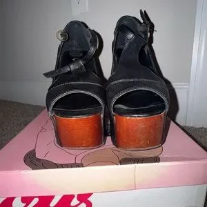 Leather black platforms with striking wood heels. Perfect for bold fashion statements. Vintage style I suppose? These are sturdy and high quality. I can include the box (slightly banged up) but easier to ship without. These still smell like leather 😍