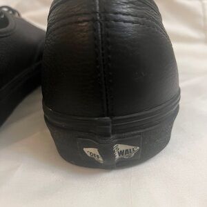 Sleek black Vans shoes crafted from leather. Gold accents add elegance.