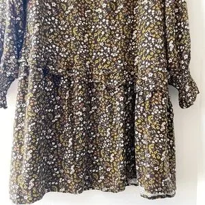 Loose shift soft flannel dress with elastic neck opening, cropped sleeves with elastic and ruffle, and an asymmetric ruffle across the bottom of the dress. Match your mini with Rylee + Cru Dark Floral Hazel Dress in Vintage Black.