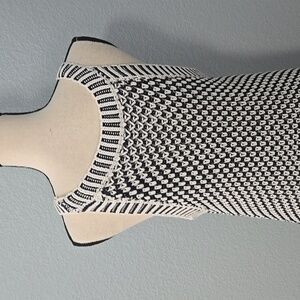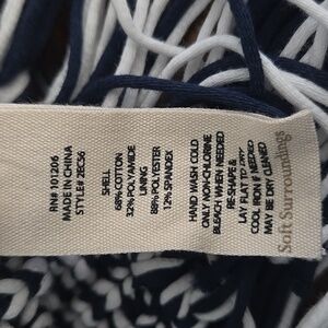SOFT SURROUNDINGS Bambado Fringe Halter Tank Top Navy Blue White Knit SZ LARGE. Very good pre owned condition. Stylish halter tank, could double as a mini dress with a striking navy and white pattern. Features a sleeveless design and fringe hem.