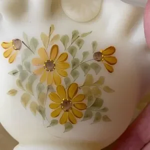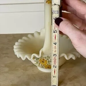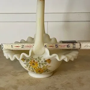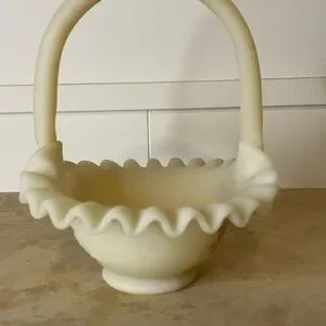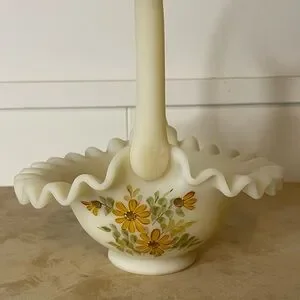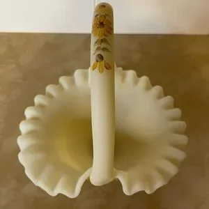 Fenton Satin Custard Glass Ruffled Glass Basket - Hand Painted & Signed