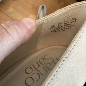 A beautiful and classic pair of pumps from Franco Sarto, perfect for adding a sophisticated touch to any outfit. These shoes are a lovely cream color and have a soft suede material. Their timeless design makes them a versatile staple for professional or evening wear.