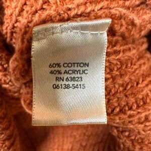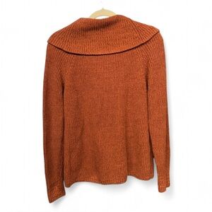 Cozy cowl neck sweater in a warm rust hue. Perfect for layering and adding style.