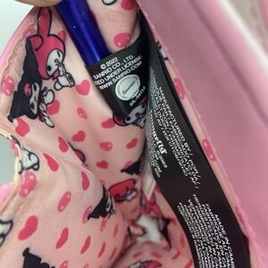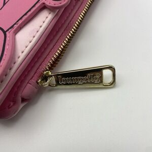 The Loungefly Sanrio My Melody and Kuromi Wallet is a stylish bifold wallet made of faux leather, featuring a cute design with My Melody and Kuromi characters in pink color. This wallet has a zipper closure and multiple credit card slots, making it practical and fashionable for women who are fans of the Sanrio franchise. The wallet is one-size-fits-all and showcases the signature Loungefly brand, adding a touch of uniqueness to any outfit.