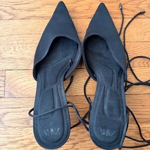 Step out in style with these elegant black heels. Perfect for any occasion, these shoes offer both comfort and sophistication. Pointy black lace up heels. Worn 3x with some wear in the heels. True to size.