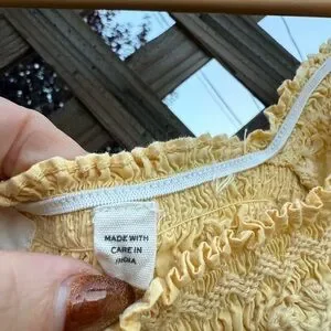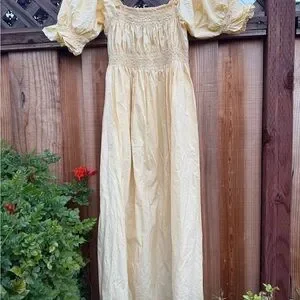 Charming yellow maxi dress by Doen. Features puffed sleeves and smocked bodice. Ideal for versatile styling. 100% pure cotton.