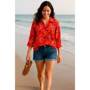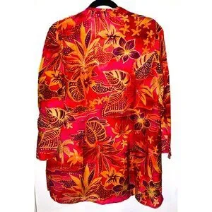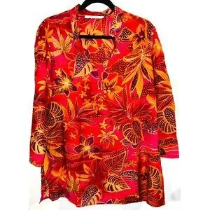 Elevate your wardrobe with this vibrant vintage tunic top, featuring a bold floral pattern in stunning red and orange hues. Crafted from lightweight silk, this blouse offers a comfortable fit and a touch of elegance. Ideal for adding a pop of color and sophistication to any outfit.
