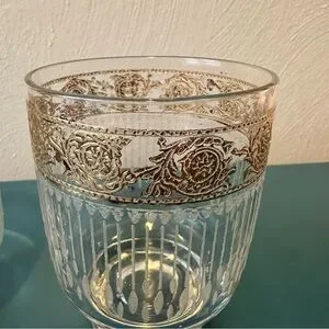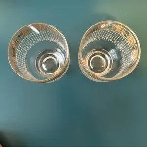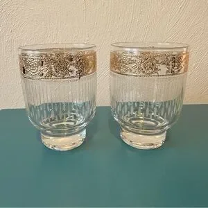 Set of two vintage glass tumblers with intricate gold rim design. Perfect for adding a touch of elegance to any table setting.