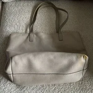 Grayish color, stains are a lot less noticeable in person l, approximately measures 15โ wide by 12โ long and 21โ with strap drop