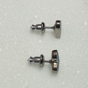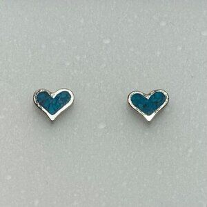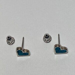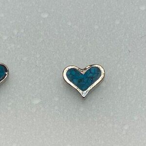 Add a pop of color and love to your outfit with these heart-shaped turquoise inlay stud earrings. The earrings are made of silver-tone metal and are 1/4 inch in length. Perfect for all occasions, these earrings are a great addition to your jewelry collection. The aqua blue color of the main stone and the coral inlay make these earrings unique and stylish. The earrings are in excellent pre-owned condition.
