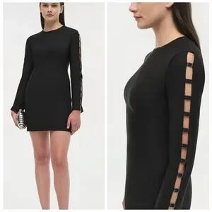 -This long sleeve mini showcases a sleek, fitted silhouette with clean lines and mini buckle details down the sleeves. Its understated elegance makes it a unique addition to any wardrobe.