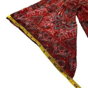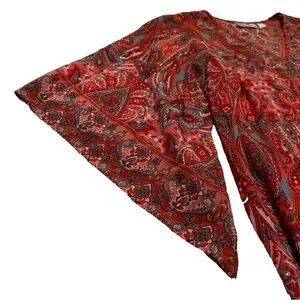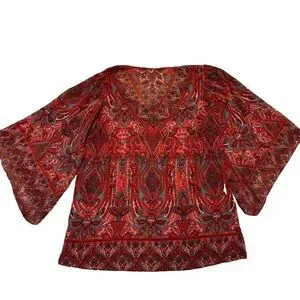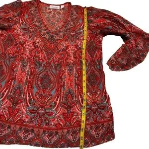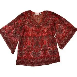 Elevate your wardrobe with this stunning Belle by Kim Gravel blouse. This vibrant red top features a captivating paisley print and flattering bell sleeves. The lightweight fabric drapes beautifully, making it perfect for any occasion.