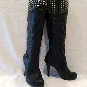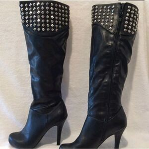 These edgy knee high boots feature diamond and circle silver studs at the top. Full length sude zipper closure. Plain almond toe design. Shaft neasyres approximately 17" from arch. Suede shimmer stretch upper. Heel is 4.5" with hidden platform. EUC.