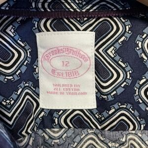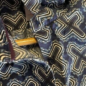 Stylish button-down shirt with a navy and white pattern. Features a classic collar and long sleeves. Perfect for casual or formal wear.